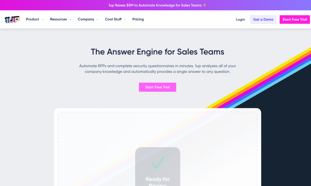 1up is a cloud platform that helps sales, security, and IT teams answer RFPs, security questionnaires, and internal product questions using a centralized knowledge base. It connects to company documents, websites, chat tools, and business systems to generate draft responses, support review workflows, and fill answers across files and web forms. Built for organizations that want faster, source-grounded questionnaire completion and easier knowledge access across go-to-market and compliance teams.