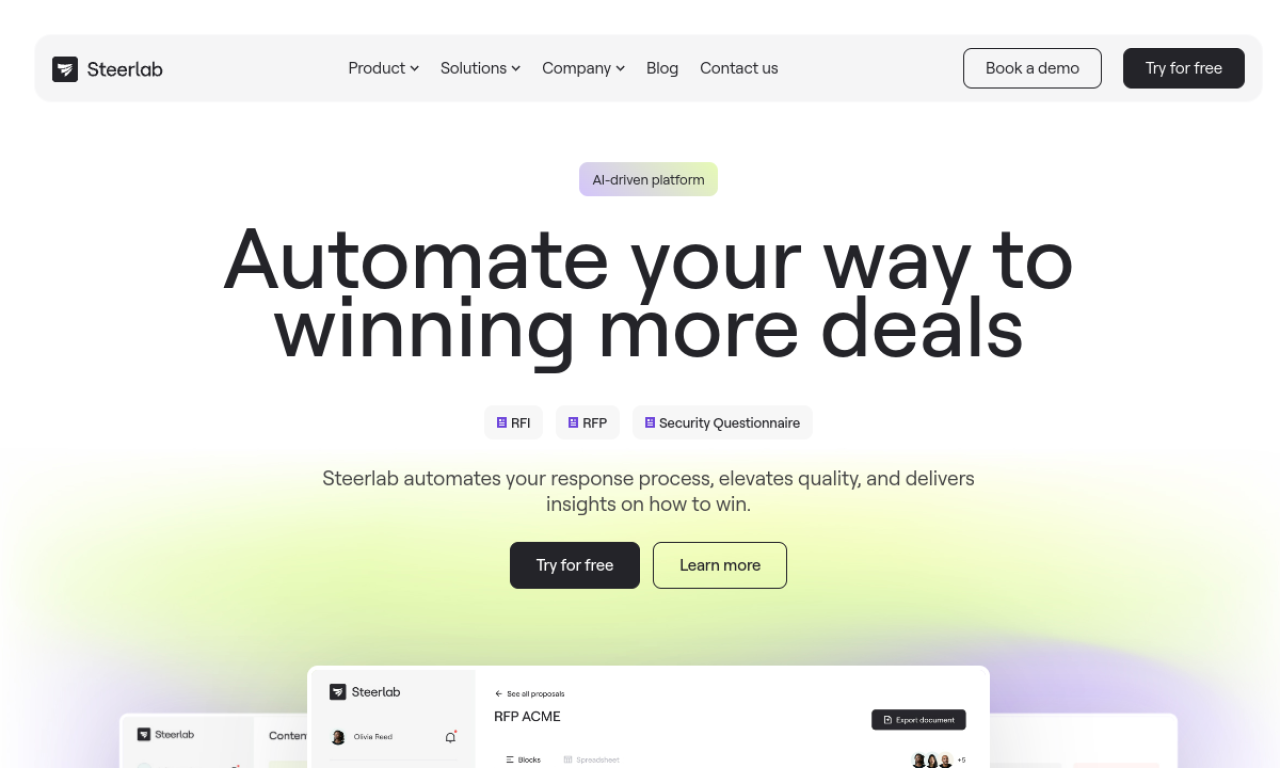 Steerlab is a cloud-based AI platform for responding to RFPs, RFIs, proposals, and vendor security questionnaires. It helps presales, proposal, and security teams generate answers, manage reusable content, collaborate on reviews, and track response performance.