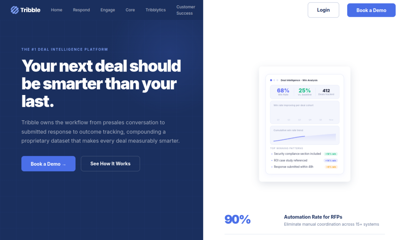 Tribble is a cloud platform that automates RFPs, DDQs, and security questionnaires while capturing knowledge from presales conversations. It combines a shared answer library, workflow automation, conversation intelligence, and win/loss analytics, with integrations for Salesforce, Slack, Teams, Gong, SharePoint, and Google Drive. Positioned for mid-market and enterprise B2B teams handling complex, high-volume responses in regulated sales environments.